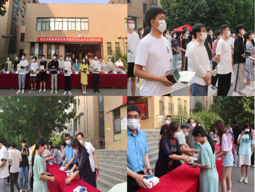 于龙子湖校区学生宿舍兰亭园前举行“铭记青春,扬帆起航”毕业生送别仪式。院党委书记马新明,院长陈振,院党委副书记张利军,副院长户小英、乔红波,系主任张慧、董奋义、姬丽娜,院办老师郑光出席仪式,院团委全体老师及2022届毕业生代表参加仪式。本次仪式由院团委副书记王肖肖主持。