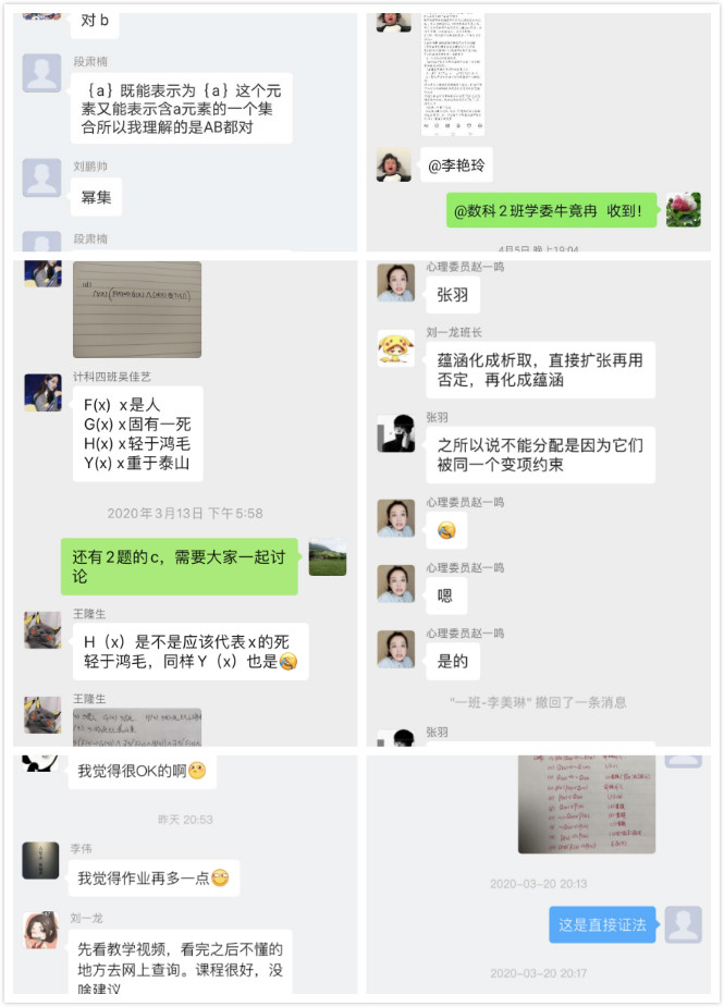 《离散数学》作为计算机专业、大数据专业和智能科学方向的专业核心课,是计算机科学的数学基础,也是后续很多专业课程(比如数据结构、算法分析、人工智能等)的基础课。因此,《离散数学》课程组十分重视课程教学方式的探索,特别是在疫情期间,如何上好这门课显得至关重要。课程组成员在春节放假期间多次沟通交流,确定每位教师的建课任务和上课模式,制定了多平台同步异步相融合的混合式教学方式。在超星平台和爱课程平台上传录播视频和学习资源,并设置测验作业及问题讨论;使用腾讯会议、钉钉等软件按照课表实现直播上课;在微信平台实现学习问题互动,并随时在线辅导答疑;推荐中国大学mocc平台上刘铎老师的国家精品课程《离散数学》资源给学生作为辅助参考。
