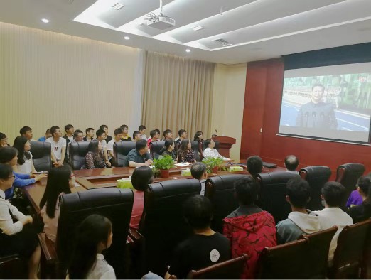 师生在龙子湖校区教学楼A405会议室观看大会直播。