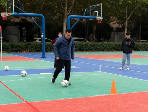 本次活动设置个人项目和团队项目,个人项目包含30秒跳绳、踢球绕杆射门、夹乒乓球和原地呼啦圈等,团队项目包含搭桥过河、螃蟹背西瓜、两人三足和运球绕杆等。整个比赛集趣味性和竞技性于一体,既是速度的角逐,又是智慧的比拼。比赛过程中,教职工个个激情饱满,全力以赴,加油声、呐喊声和欢呼声荡漾在篮球场上空。