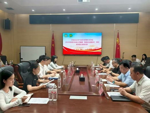 于繁塔楼A405会议室召开2025年暑期“智慧农业国际化”项目研学团赴新西兰林肯大学学习交流行前培训会。校国际交流与合作处处长屠克、校党委学工部部长徐峰、体育学院院长唐大鹏莅临现场,院长陈振、副院长赵亚芳出席会议,院团委书记张玥、项目带队老师田康、研学项目合作企业代表刘畅及2025研学团全体成员参加本次培训会。会议由张玥主持。