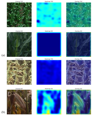 针对现有光学遥感技术在中高冠层覆盖条件下易受植被指数饱和影响,导致监测效果下降的问题,该研究利用配备全景相机的UGV采集玉米冠层内部(IOC)图像,分析雌穗特征;同时,借助配备高清数码相机和光谱相机的UAV采集冠层顶部(TOC)图像,提取叶片和雄穗特征,从而自动化识别12个生长时期的冠层高度、叶片及雌穗特征。在此基础上,团队开发了多模态深度学习框架MSRNet(Maize-Phenological Stages Recognition Network),融合冠层高度、植被指数、顶部叶片及内部雌穗等多源特征,实现玉米12个物候期的精确识别。与传统机器学习及单模态深度学习模型对比,该模型在V2-R6阶段的识别准确率达84.5%,较基准方法提升3.8%-13.6%。Grad-CAM可视化结果进一步证实,MSRNet能根据生长阶段动态调整注意力机制:在营养生长期聚焦叶片特征,在生殖生长期转向果穗特征。