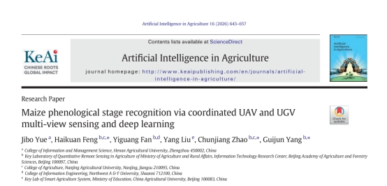 智慧农业科技创新团队的研究成果“Maize phenological stage recognition via coordinated UAV and UGV multi-view sensing and deep learning”——在国际智慧农业领域知名期刊《Artificial Intelligence in Agriculture》在线发表。该研究提出了一种无人机(UAV)与地面无人车(UGV)协同的多视角感知策略,并结合自主设计的深度学习模型MSRNet,实现了对玉米12个关键物候期的精准识别,为作物育种中的高通量表型监测难题提供了创新解决方案。