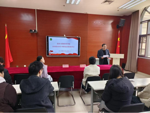 于龙子湖校区繁塔楼A418召开2026届本科生考研复试调剂指导会。本次会议特邀董奋义老师、董萍老师为同学们答疑解惑、传授经验。会议由院毕业班辅导员倪天娇主持。